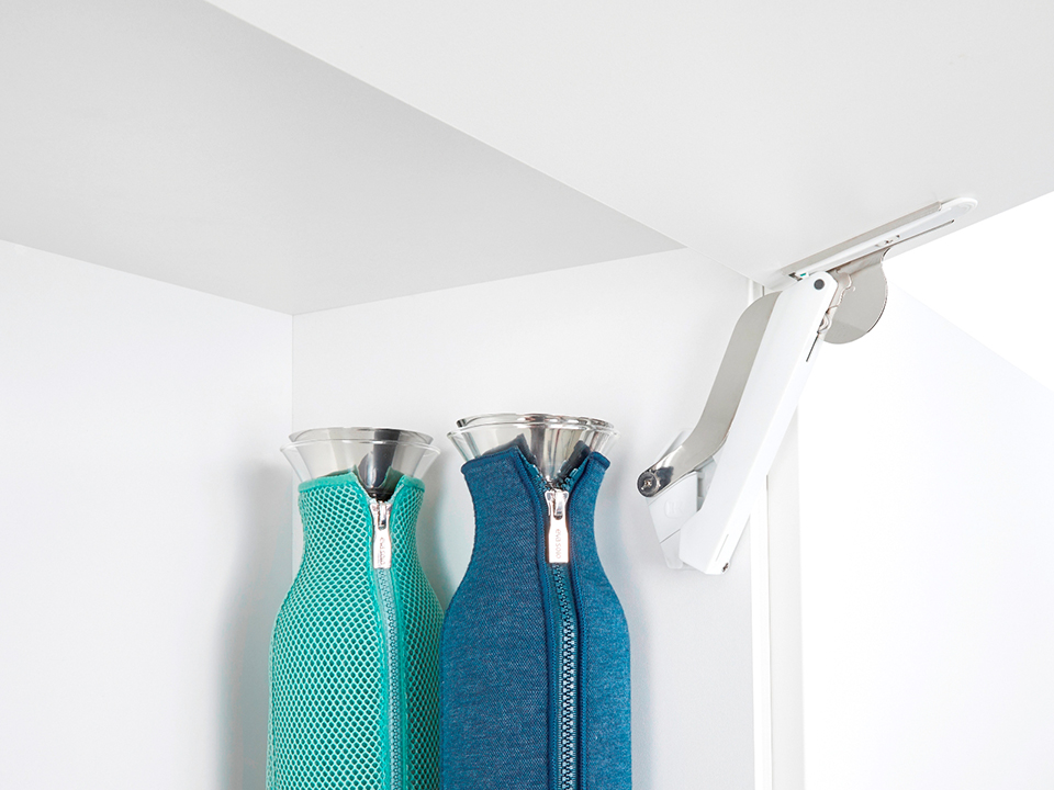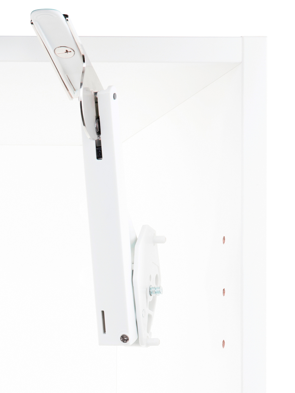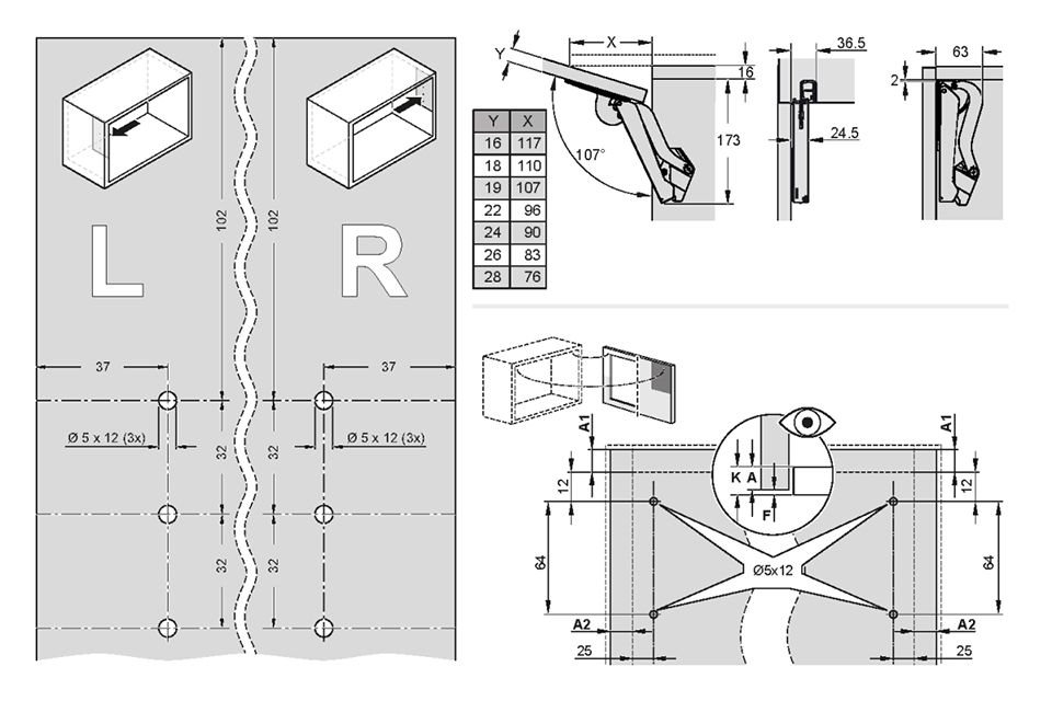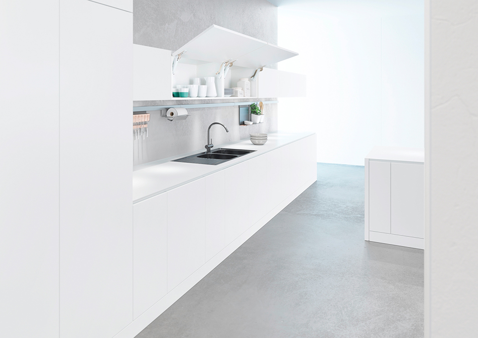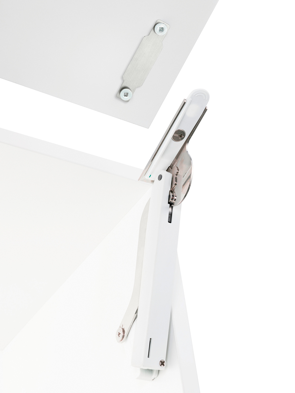 Kompletní sada pro výklop na horní skříňky bez použití závěsů s minimalistickými rozměry kování. Výška čela 200-650mm, šířka až 1800mm. Integrovaný omezovač úhlu otevření 107°=>90°.