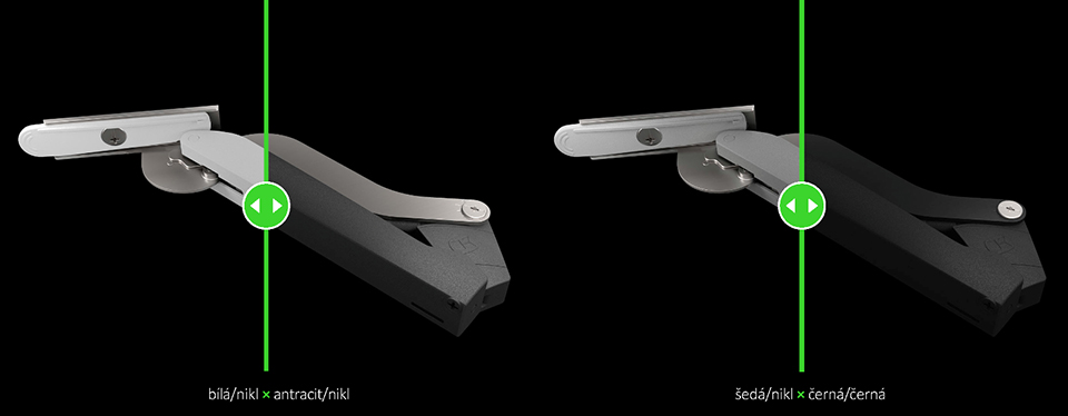 Kompletní sada pro výklop na horní skříňky bez použití závěsů s minimalistickými rozměry kování. Výška čela 200-650mm, šířka až 1800mm. Integrovaný omezovač úhlu otevření 107°=>90°.