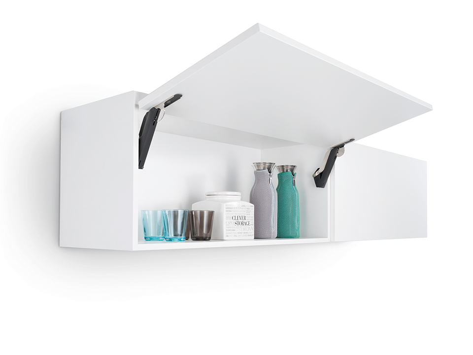 Kompletní sada pro výklop na horní skříňky bez použití závěsů s minimalistickými rozměry kování. Výška čela 200-650mm, šířka až 1800mm. Integrovaný omezovač úhlu otevření 107°=>90°.
