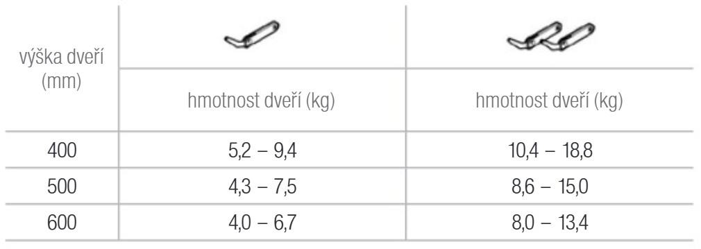 Nosnost kování závisí na velikosti a váze dvířek a počtu mechanismů. Hodnoty jsou uvedeny pro jeden mechanismus: