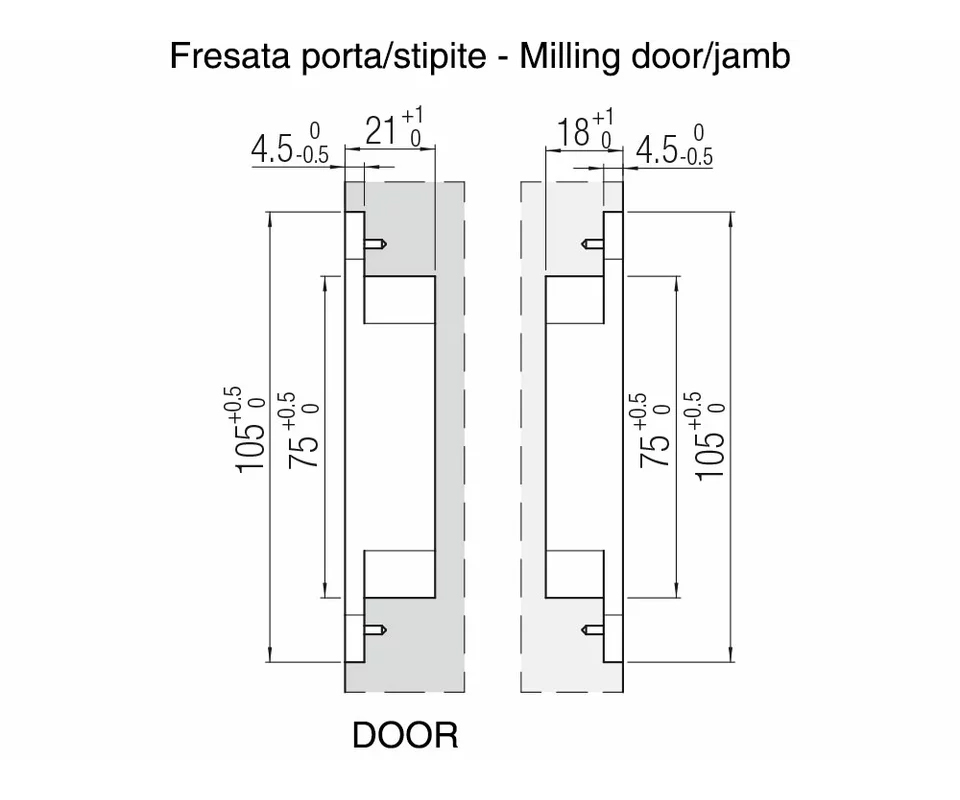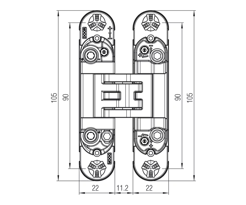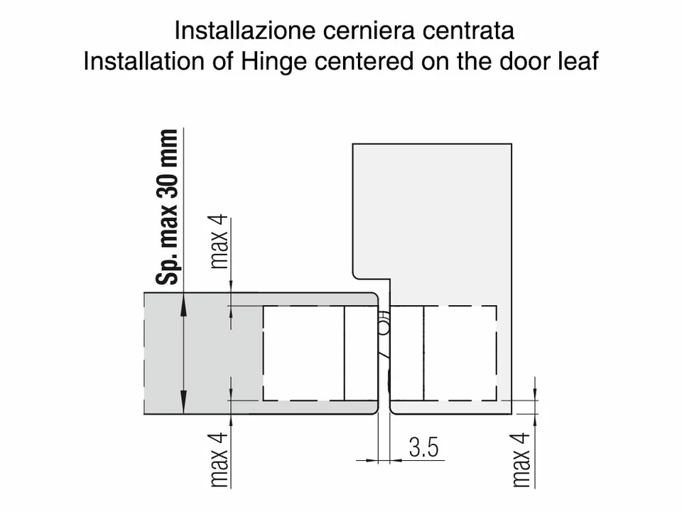 Závěs pro bezfalcové dveře s 3D seřízením . Maximální nosnost dveří je 30 kg pro 2 kusy závěsů, maximální tloušťka dveří je 30 mm. Volitelné příslušenství jsou příchyty pro obložkové či ocelové zárubně. Montážní šablona 256045 (rám) + 268077 (vklady)