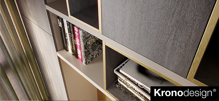 Inspirací vám může být použití dřevodekoru K079 PW Grey Clubhouse Oak v neutrálním šedém tónu s jemnou kresbou na větších plochách. Plochy oživíte odstínem 5981 BS Cashmer. Přestože tento odstín vytváří k dřevodekoru kontrast, barevně na něj navazuje. Dojem luxusu je zachován použitím kovolaminátu AL04 Brushed Gold na stěně za postelí, čímž vznikne dominantní prvek celé ložnice.