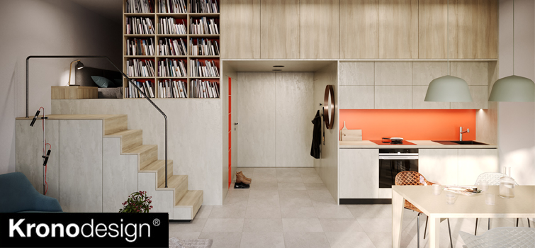 Na pracovní desce a desce stolu, na horních skříňkách a schodišti je zakomponovaný dřevodekor K017 PW Blonde Liberty Elm, který patří do kategorie světlých neutrálů. Celou místnost nakonec rozzáří oranžový odstín 176 BS Flame v podobě obkladu za pracovní deskou.