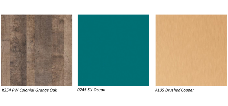 Tento zajímavý dekor byl doplněn výrazným tyrkysovým odstínem 0245 SU Ocean na spodních skříňkách kuchyňské linky. Jedná se o barevně sytý dekor plný energie. Měděný kovolaminát AL05 Brushed Copper svým metalickým povrchem oba dekory rozzáří a dodává interiéru dojem luxusu a originality. V návrhu je použit na zástěně kuchyňské linky a najdete ho rovněž na stěně za televizí.