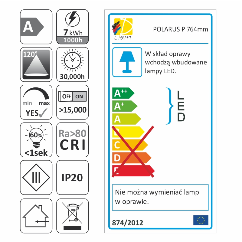 Polarus P 7W je moderní LED svítidlo o délce 764 mm pro zásuvky, vybavené inteligentním bezdotykovým spínačem, který zapne osvětlení po otevření zásuvky a vypne ihned po zavření. Svítidlo je vybaveno výkonnými 2835 diodami, které zaručují velké množství světla. Barva světla - neutrální bílá. Jmenovité napětí[V]: 12. Max. výkon[W]: 7. Kmitočet[Hz]: 50. Třída izolace: III. Stupeň krytí IP: 20. Montáž na normálně zápalné podklady: F. Úhel osvětlení: 120°. Světelný tok: 524m. Index vykreslení barev CRI:> 80. Svítidlo Polarus P je svítidlo určené pro přímou montáž na nábytek. Díky použití LED diod jako světelného zdroje je svítidlo energeticky efektivní a zahřívá se jen v malém rozsahu.