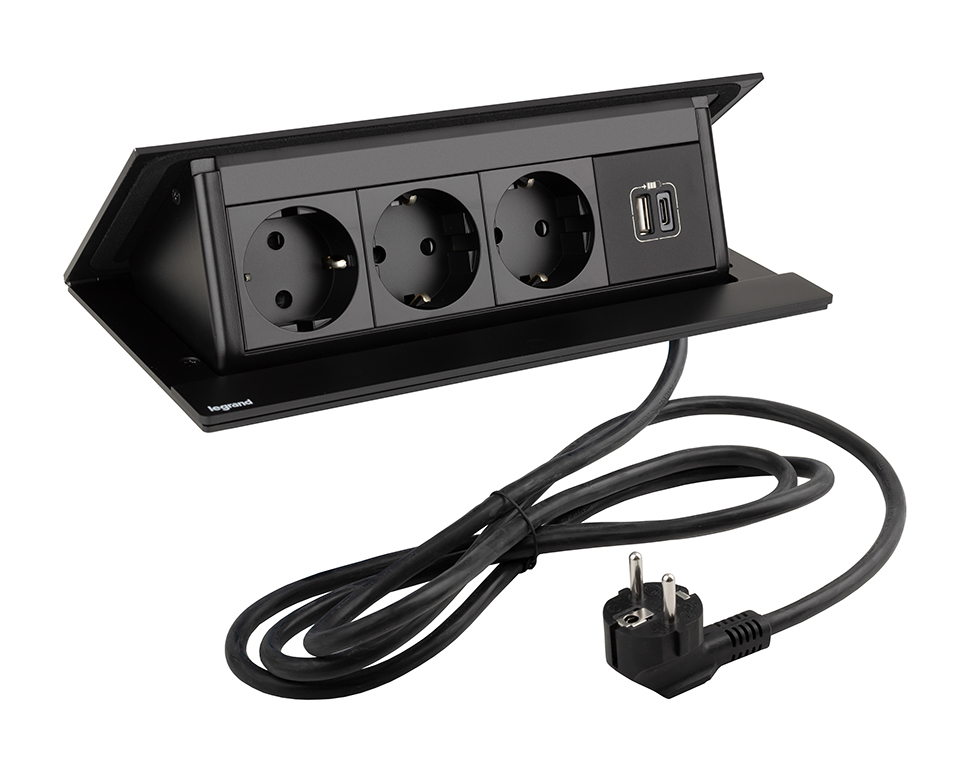LEGRAND elektrická zásuvka PopUp, 3x 230V, Schuko, 1x USB A+C, černá matná