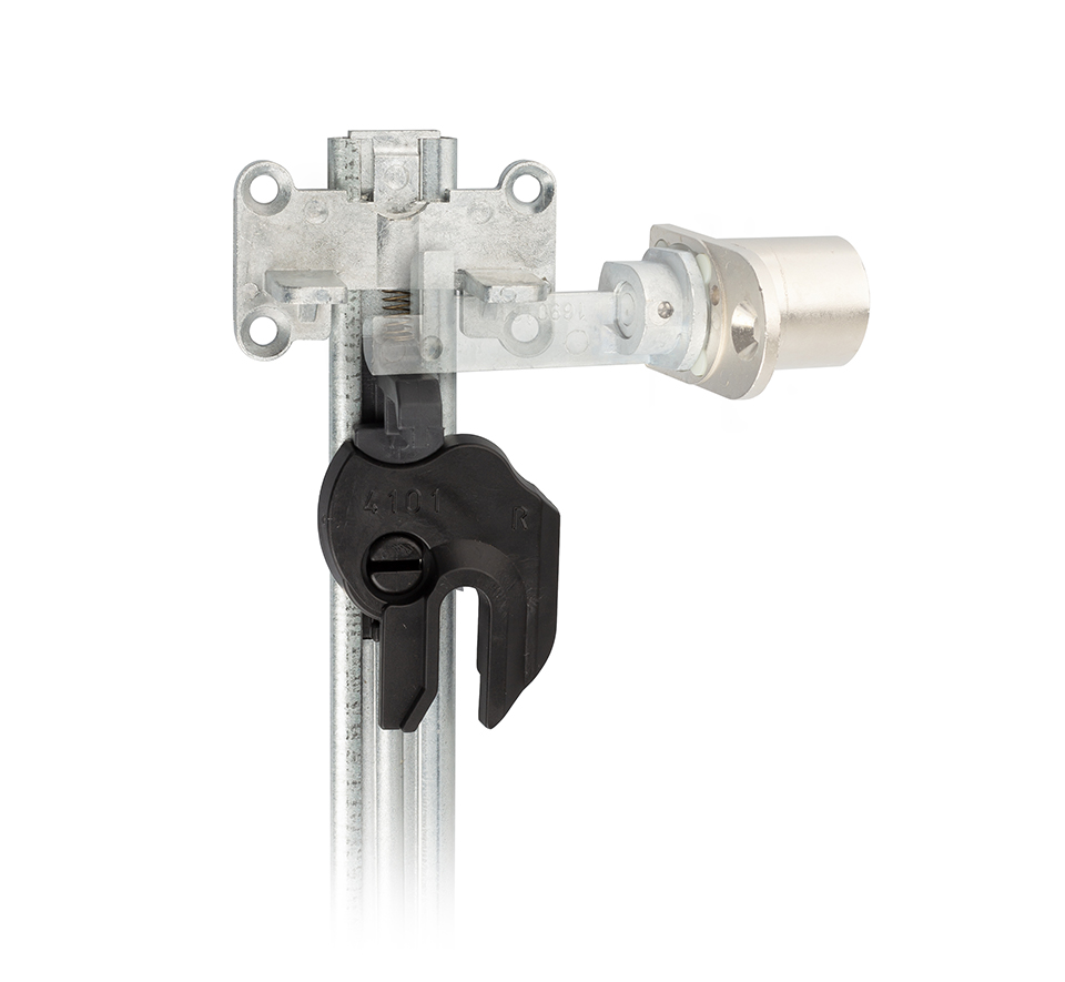 Univerzální zámková tyč pro centrální zamykání zásuvek s výsuvy. Protikus instalovaný na čílko zásuvky.