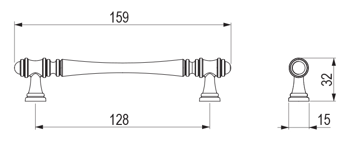 Kovová úchytka s roztečí 159mm, v celkové délce 128mm. Šířka: 15mm Výška: 32mm