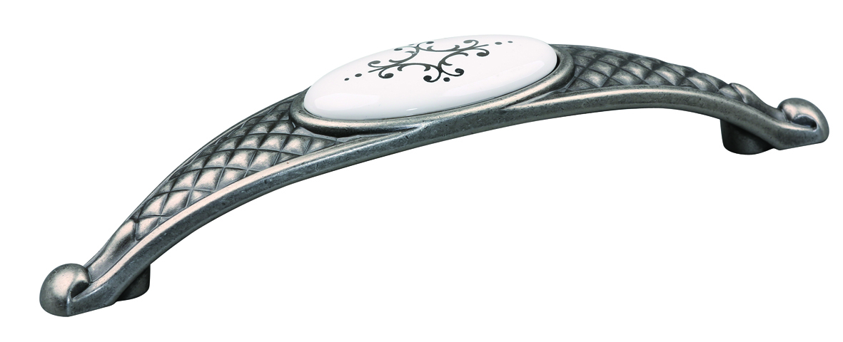 úchytka starostříbro/porcelán bílý/motiv, rozteč 128 mm, délka 161 mm, šířka 32, výška 33 mm.