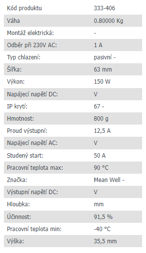 Spínaný síťový zdroj pro napájení LED Mean Well 8,4..12V/12,5A, 150W. Výstupní napětí: 8,4..12V
