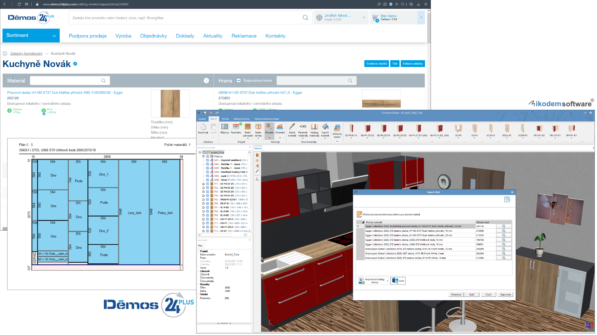Furniture Studio je software pro návrh a výrobu zakázkového nábytku. Uživatel v něm má možnost vytvářet 3D návrhy interiérů a získat výrobní dokumentaci včetně nářezových plánů. A právě v oblasti nářezových plánů byl vytvořen snadný export dat do našeho on-line formuláře pro zakázky formátování na portále Démos24Plus.