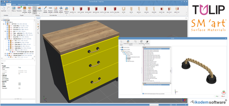 Nová verze programu Furniture Studio navíc obsahuje více než 500 modelů úchytek TULIP, kolekci dekorů SM’art a pro zásuvkové systémy jsou zde nastaveny výsuvy STRONGBOX.