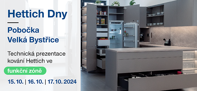 Na naší pobočce ve Velké Bystřici se v půlce října uskuteční Hettich Dny. V úzkém kruhu vám odborník z firmy Hettich ukáže a vystvělí montážní postupy, prozradí vám tipy a triky při výrobě nábytku s použitím kování Hettich v naší funkční zóně.