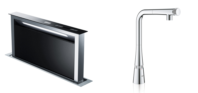 Místo závěsné digestoře jsme v tomto případě použili kovové regály Q-bit, které tvoří pomyslnou bariéru mezi kuchyňskou a jídelní částí. Celou kolekci Q-bit lze objednat v různých rozměrech i odstínech (dle vzorkovníku RAL). Digestoř je v tomto případě ukryta ve skříňce pod varnou deskou, přesně se jedná o typ Franke FDW 908. Další zajímavostí je v této kuchyni také vodovodní baterie Zedra ovládaná dotykem, které nechybí praktická výsuvná sprcha.