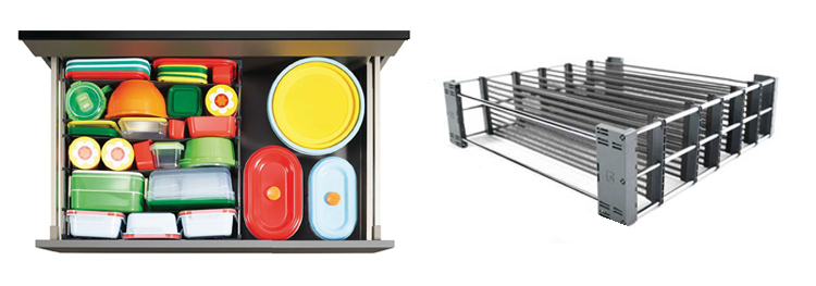 V kuchyňské lince je však důležité i kování a vnitřní vybavení. Pro lepší přehlednost ve výsuvech se bude hodit organizér Spaceflexx, jenž má přepážky vyrobené z elastického materiálu a lze je prát v pračce. Tento šikovný doplněk získal prestižní ocenění Red Dot Award 2020 v kategorii Best of the best.