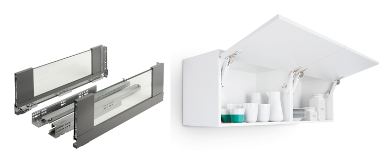 Také výsuvy – tedy vnitřní pohledové kování lze volit v bílé barvě a sladit ho s ostatními kovovými prvky. Mezi takové patří StrongMax se skleněnými bočnicemi. Za zmínku stojí i horní výklopné kování Freelift, které se velmi jednoduše montuje.