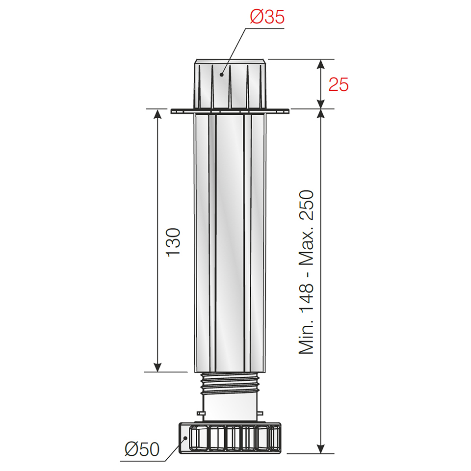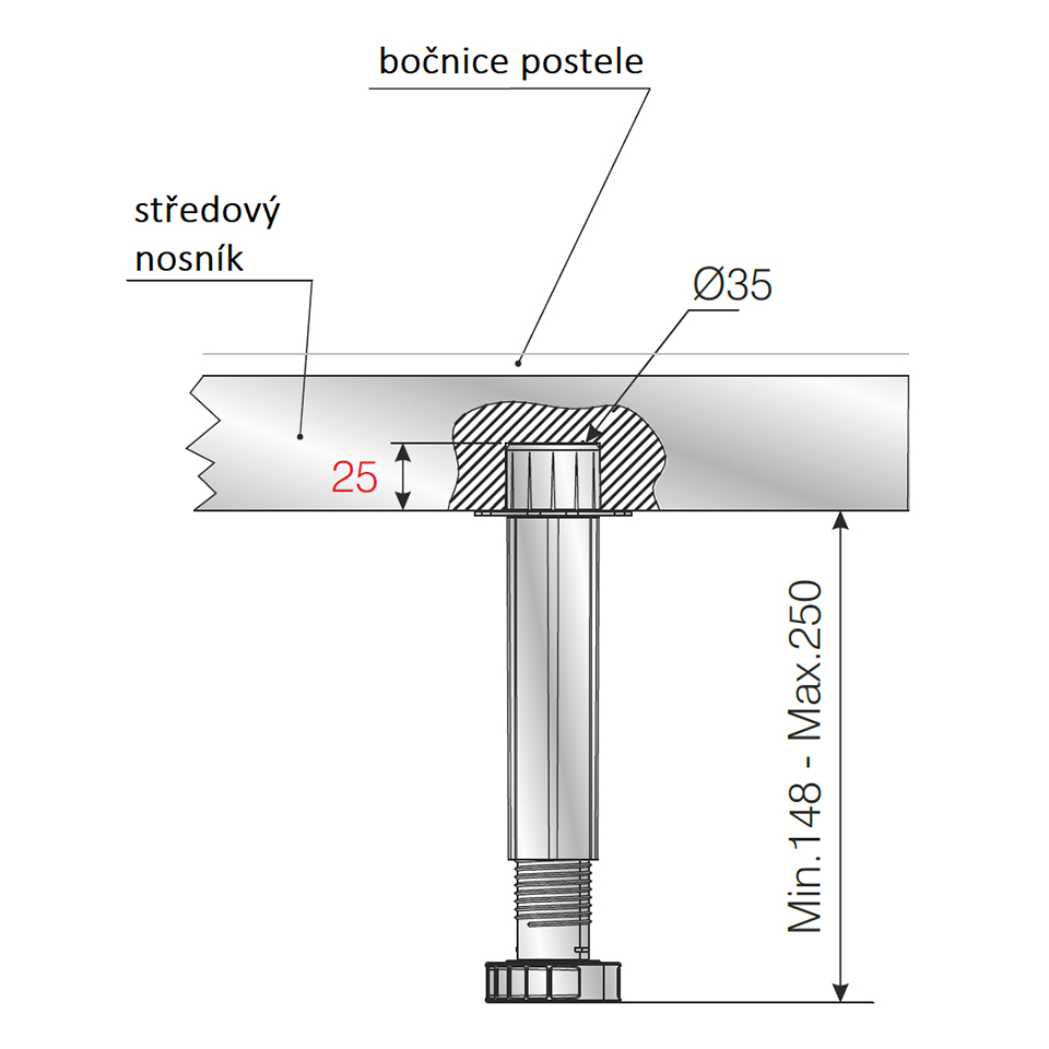 Opěrná rektifikační noha postelového středového nosníku 148-250mm