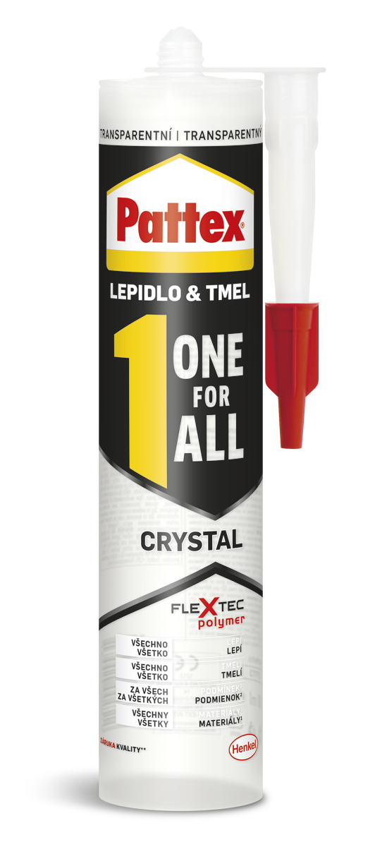 One for all CRYSTAL je tranparentní montážní lepidlo vhodné pro lepení většiny savých i nesavých materiálů jako jsou cihla, keramika, beton, sololit, sádrokarton, překližka, kámen, MDF, dřevo, kov, UPVC, sklo, plasty, již natřené povrchy, zrcadla.