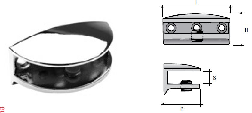 Podpěra pro skleněné police tloušťky 11 mm, povrchová úprava satin chrom.