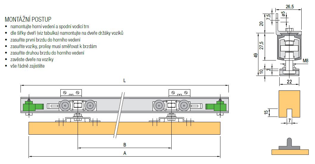 Sada kování pro jedno křídlo s brzdou. Minimální šířka dveří - 600 mm. Nosnost: 40 kg. Náhradní, případně doplňující sada v případě použití druhého křídla ke kování viz. související sortiment. Skladem i verze s tlumením - 393273 Posuvné interiérové kování 1399 40kg 2x tlumič.
