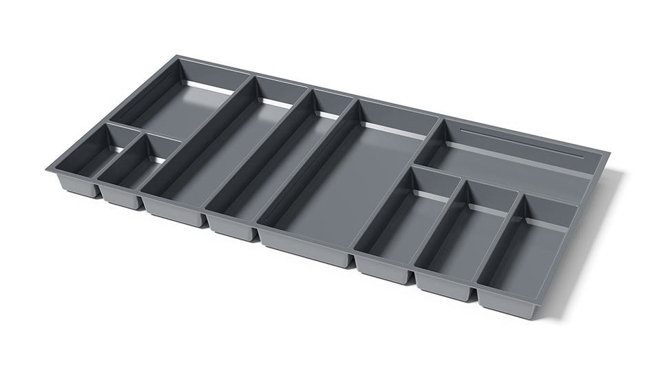 Vložka příborníku SKY pro zásuvky blum Antaro a užší - šířka korpusu 1000mm. Kombinace pevných přihrádek a pohyblivých přepážek (k dokoupení zvlášť). Pro užší typy zásuvkových systémů možno zúžit a zkrátit. Barva antracit.