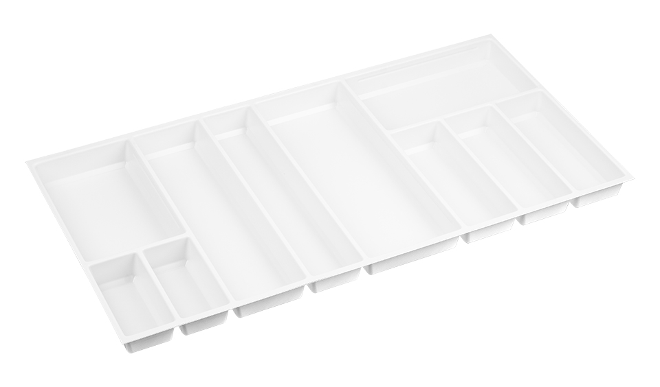 Vložka příborníku SKY pro zásuvky blum Antaro a užší - šířka korpusu 1000mm. Kombinace pevných přihrádek a pohyblivých přepážek (k dokoupení zvlášť). Pro užší typy zásuvkových systémů možno zúžit a zkrátit. Barva bílá.