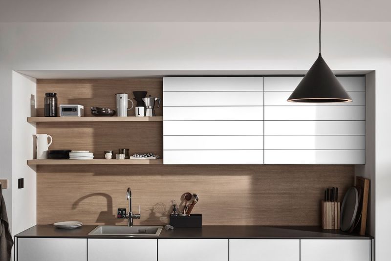 Komplet roletkové skříně s lamelovou čelní plochou RAUVISIO crystal, 2 police uvnitř kompletu, čelní plocha - Piano matná/ černý korpus, výška 780 mm, šířka 900 mm, hloubka 373 mm, Nosnost 50 kg.