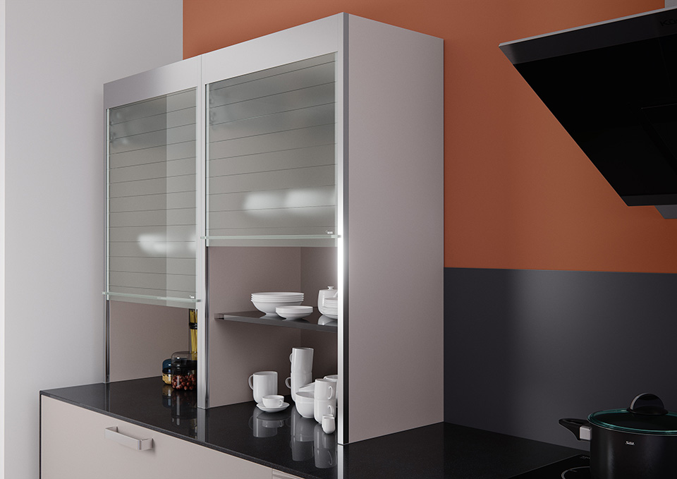 Skleněný rol.systém pro vert.skříně.Lamely z bezp.skla v šířce 50mm(barva kouřová).Dodáváno v kazetách.Vnitřní hloubka skříně min. 296mm.