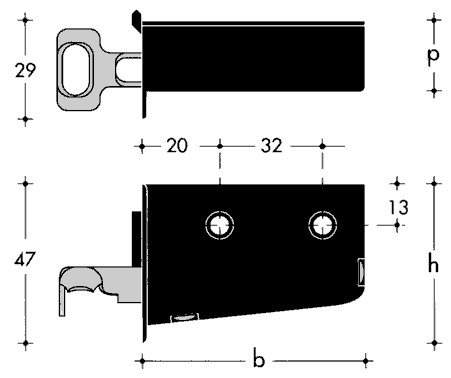 Závěsné kování SCILM (Itálie) pro horní zavěšené korpusy. Montáž vruty na bočnici korpusu. Nosnost 70 kg/kus (140 kg/pár). Maximální nosnost je ovlivněna upevněním kování do korpusu a upevněním závěsného protikusu/lišty do stěny.
