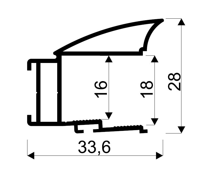 Umožňuje kombinovat DTD 18mm a zrcadlo 4mm nebo bezpečnostní sklo 4,5mm. Povrchová úprava - stříbrná elox. Materiál - hliník.