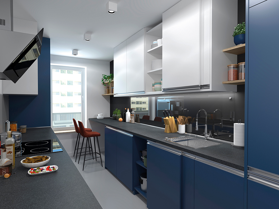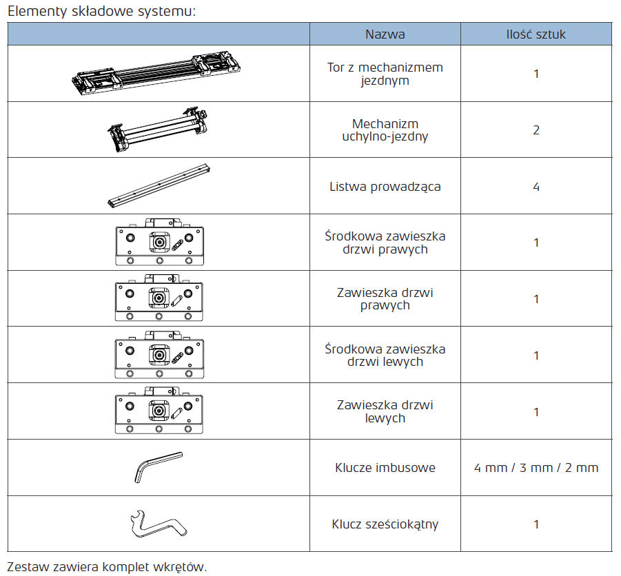 Sada kování pro dvoje dveře v jedné rovině. Vnitřní šířka skříně 1150 - 1750 mm, šířka jednoho křídla 600 - 900 mm, výška křídla max. 1000 mm, max. hmotnost křídla 20 kg. Tloušťka materiálu 15 - 22 mm. Sada obsahuje veškeré kování pro otevírání dveří. Vedení s pojízdným mechanismem je možno montovat na půdu i pod dno.