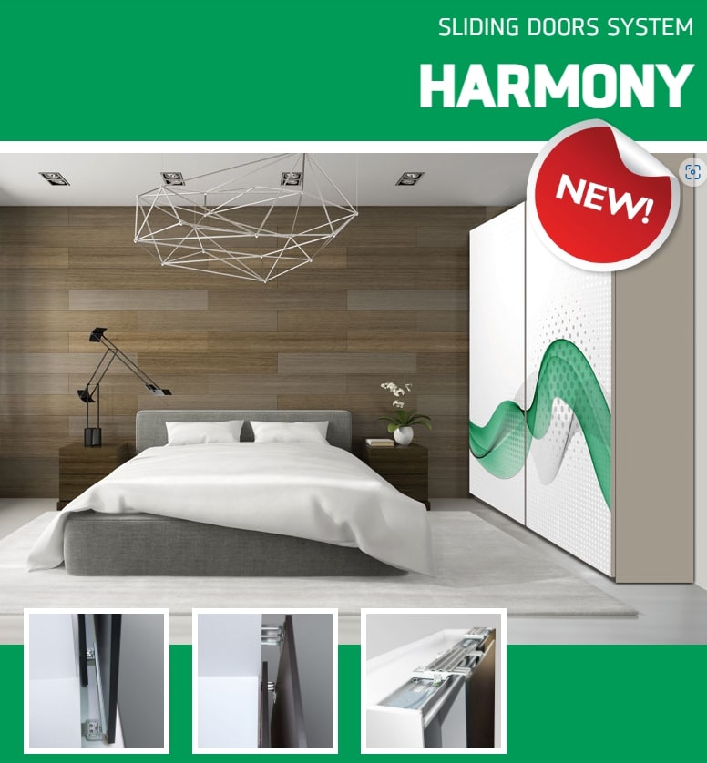 Sada kování pro dvoje dveře v jedné rovině. Pro vnější šířku skříně 1650 - 2050mm. pro tloušťku materiálu 16 - 45mm. Nosnost jednoho křídla - 60 kg.