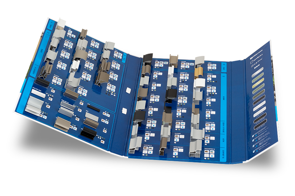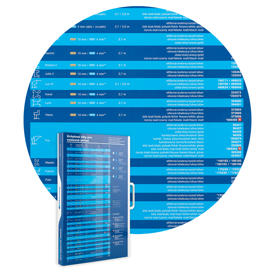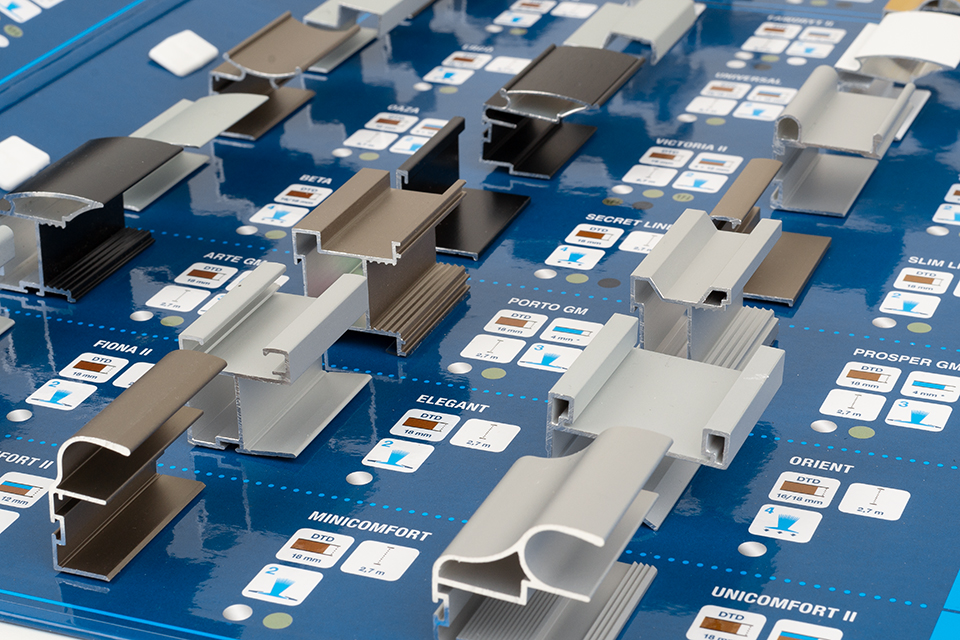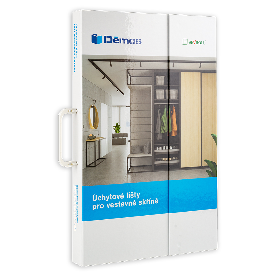 Vzorky úchytových lišt pro kování Sevroll, Astin a SimpleBlue. Šanon neobsahuje vzorek profilu z povrchovou úpravou "černá strukturální", ten si lze objednat pod kódem 526554 SEVROLL Alfa II úchytová lišta 100mm černá strukturální (vzorek).
