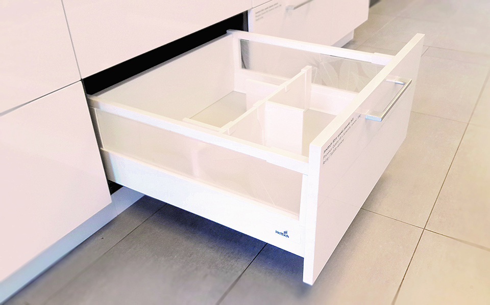 Jak jsme napsali výše, změny jsou viditelné na první pohled. Rozměry zásuvek a přířezů zůstaly stejné, stejně jako výška bočnic a nadstaveb. Máte tak k dispozici ucelenou řadu kování ve třech barvách, hloubkách od 260 do 620 mm, výškách 54 a 70 mm (základní vnitřní výšky bočnic – počítáno od dna zásuvky) a nadstavbových výškách 144 a 176 mm. Stačí jen doplnit o výsuvy Quadro s nosnostmi od 25 kg (částečný výsuv), 30 nebo 50 kg (plnovýsuv V6 a V6+) v provedení s tlumeným dojezdem Silent system (SiSy), "push to open" mechanikou pro bezúchytkové otvírání (P2O).