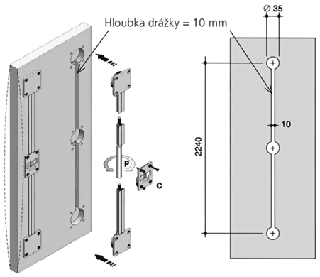 Na DTDL 18mm. Hloubka drážky 10mm, šíře 10mm, ukončení pr. 35mm.Závitové tyče jdou krátit.Do šířky dveří 750mm stačí jeden kus,u širších použijte 2 kusy.