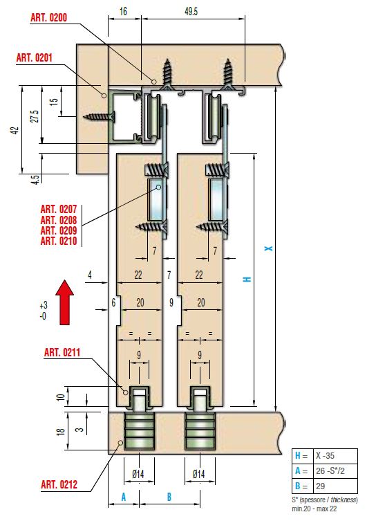 Pro lamino 16-18mm Nosnost: 25 kg Sada obsahuje kování pro jedno křídlo - 2x vozík, 2x brzda, 1x vodící trn. Výška křídla = výška otvoru - 35mm. Náhradní brzda - 346817 SIS-art.0202 brzda.