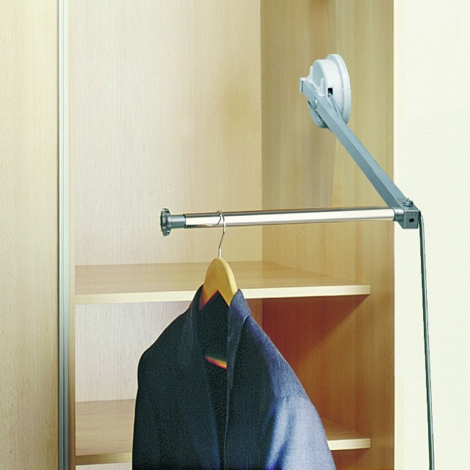 Jednostranná sklopná šatní tyč. Montáž na pravou stěnu korpusu. Nosnost 12 kg.