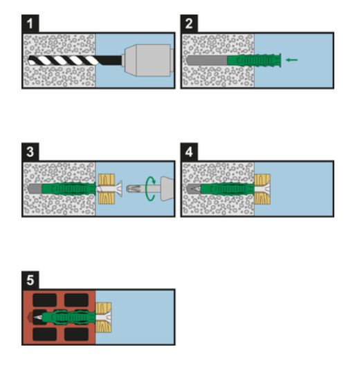vhodné do všech stavebních materiálů. Možné venkovní použití v kombinaci se šrouby z nerezové oceli. Délka šroubu = Délka upevnění E + min. délka k zašroubování D. Vhodný pro předem připravenou instalaci. Zajišťuje rovnoměrné rozložení síly. Límec hmoždinky chrání povrch stavebního materiálu a zabraňuje jeho sklouznutí do předvrtaného otvoru. Rotační jištění zabraňuje otáčení hmoždinky ve stavebním materiálu při zašroubování šroubu. Na hrdlo hmoždinky není vyvíjen expanzní tlak, což zabraňuje odlupování omítky nebo dlaždic.