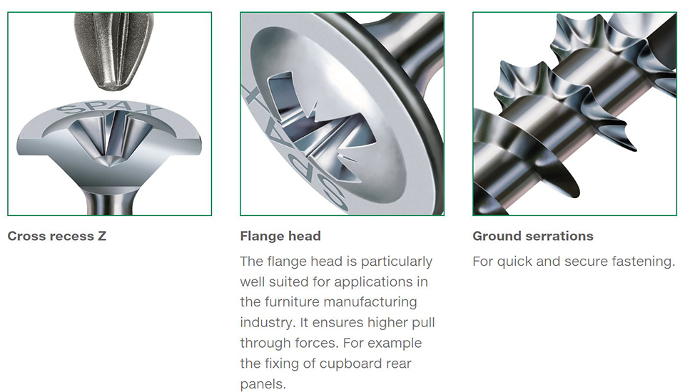 Vhodné pro upevňování zad ke korpusu. SPAX Nr.: