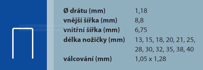 Spony pro průmyslové spojovače kvalitní spony vhodné pro většinu používaných sponkovaček, na upevňování zad korpusů apod. kompatibilní se systémy 92 (Akes, Atro, Bea, Bostitch, Haubold, Josef Kihlberg, Nikema, Omer, Senco, Schneider) a systém H (Holzher, Prebena) balení 2800 ks/bal. rozměr válcování 1,05 × 1,28 mm