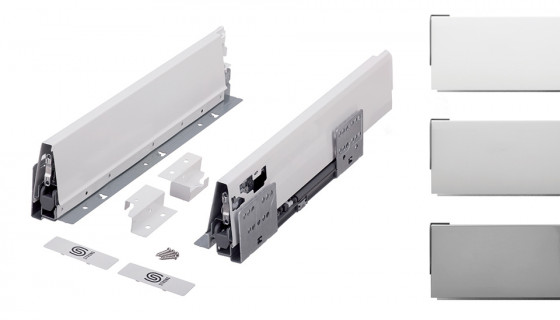 Výsuv s tlumením a dutou bočnicí. Délka 450mm, výška 86(105mm). Nosnost do 35kg. Barva šedo-stříbrná (titan). Vše potřebné pro sestavení čelní zásuvky v této sadě. Pro vnitřní zásuvku je nutno doobjednat čelní panel a držáky.