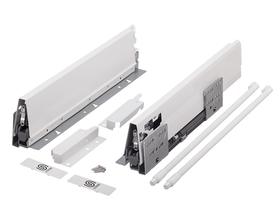 Výsuv s tlumením a dutou bočnicí včetně 1 páru relingu. Délka 400mm, výška 140(165mm). Nosnost do 35kg. Barva bílá. Vše potřebné pro sestavení čelní zásuvky v této sadě. Pro vnitřní zásuvku je nutno doobjednat čelní panel.