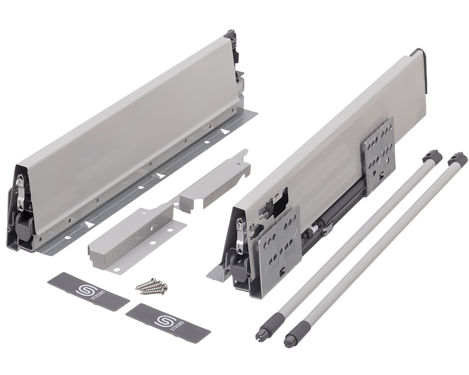 Výsuv s tlumením a dutou bočnicí včetně 1 páru relingu. Délka 550mm, výška 140(165mm). Nosnost do 35kg. Barva šedá. Vše potřebné pro sestavení čelní zásuvky v této sadě. Pro vnitřní zásuvku je nutno doobjednat podle šířky korpusu čelní panel.