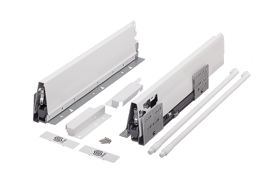 Výsuv s tlumením a dutou bočnicí včetně 1 páru relingů. Délka 350mm, výška 204(225mm). Nosnost do 35kg. Barva bílá. Vše potřebné pro sestavení čelní zásuvky v této sadě. Pro vnitřní zásuvku je nutno doobjednat čelní panel.