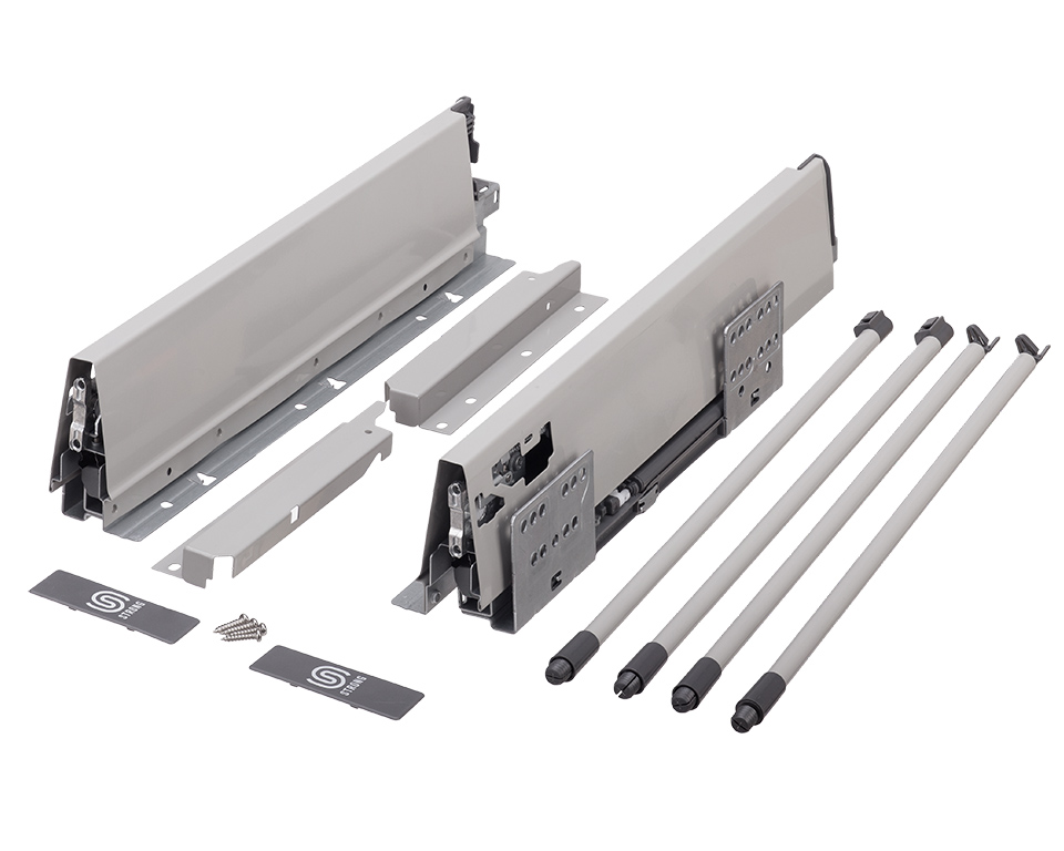 Výsuv s tlumením a dutou bočnicí včetně 2 párů relingů. Délka 350mm, výška 204(225mm). Nosnost do 35kg. Barva šedá. Vše potřebné pro sestavení čelní zásuvky v této sadě. Pro vnitřní zásuvku je nutno doobjednat podle šířky korpusu čelní panel.