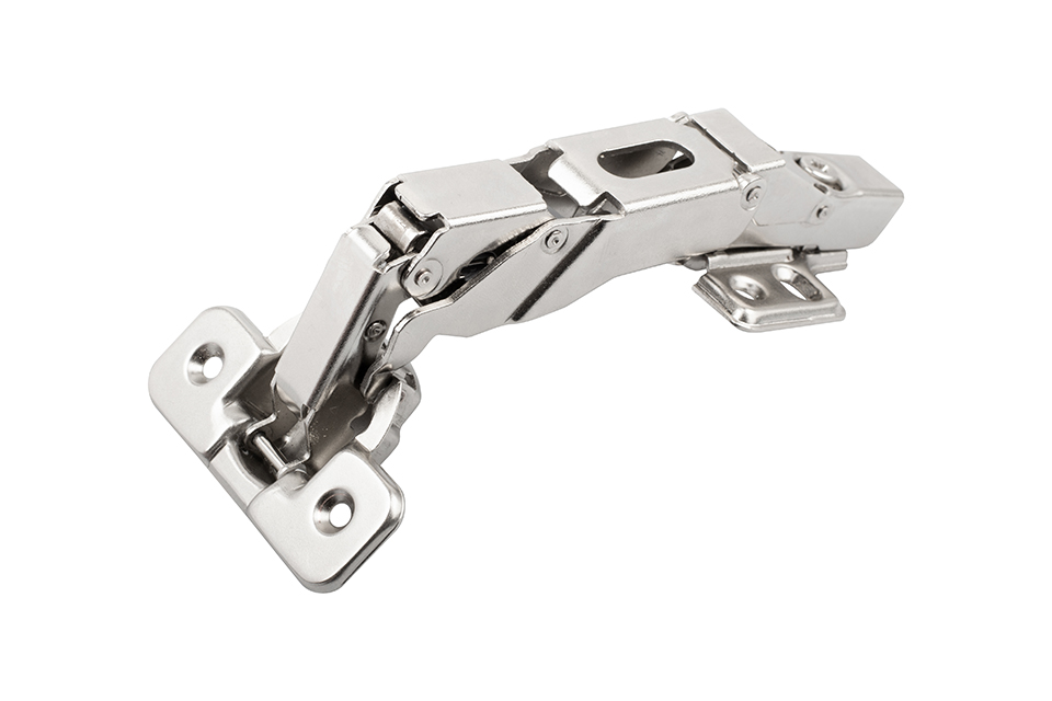 Závěs naložený 155° s nulovým přesahem, bez tlumení, klipový. Seřízení mezery mezi dveřmi a korpusem pomocí excentru.