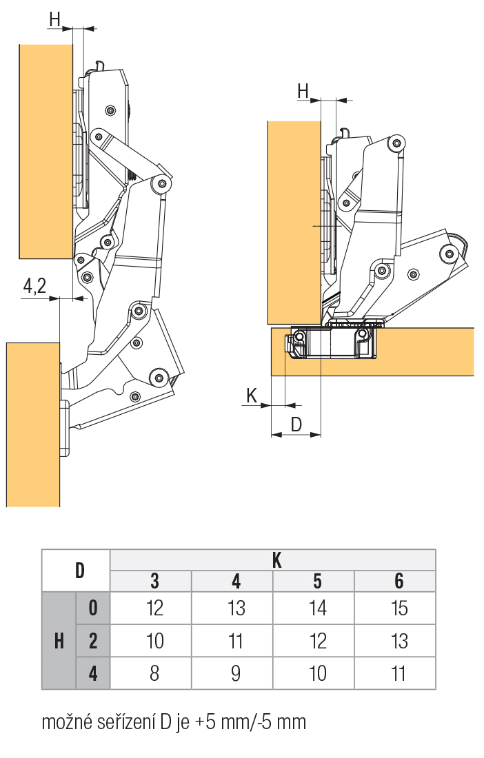 Závěs naložený 155°s nulovým přesahem, s tlumením, klipový. Seřízení mezery mezi dveřmi a korpusem pomocí excentru. Při otevření na 90° jsou dveře zcela mimo vnitřní prostor skříňky.