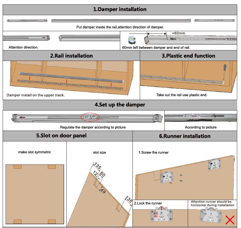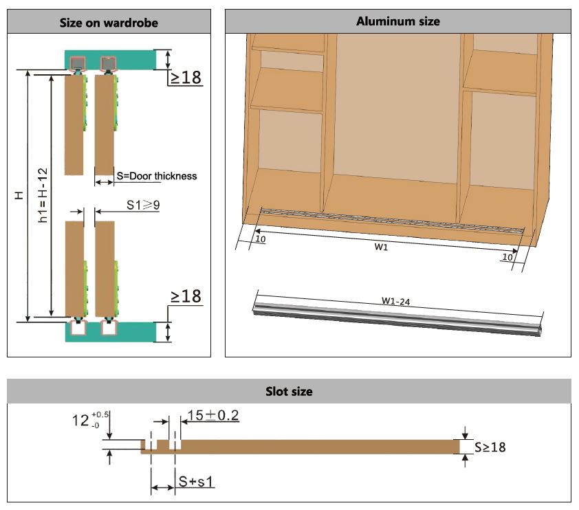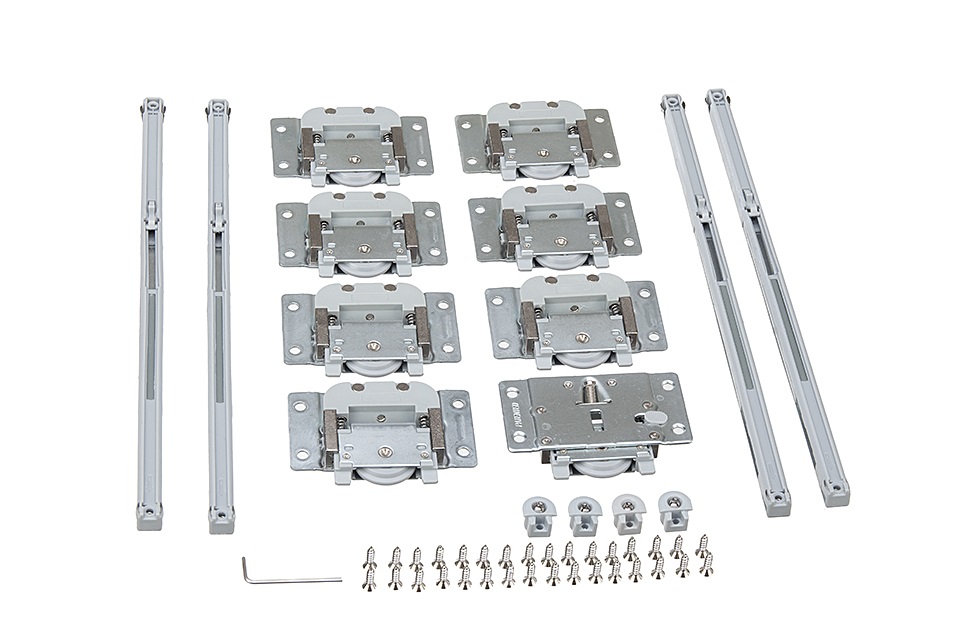 Sada kování na skříňové posuvné dveře, nosnost 40 kg/dveře, sada pro dvoje dveře. K dispozici vedení v délkách 1,5m, 2m a 3m viz. související sortiment níže. Doporučená minimální šířka křídla - 500mm, výška <2500mm při dodržení poměrů stran 3:1 (výška:šířka). Sada obsahuje: 4x tlumič, 8x vozík, 4x spodní doraz, 32x vrut, 1x imbusový klíč. Upozornění k montáži: