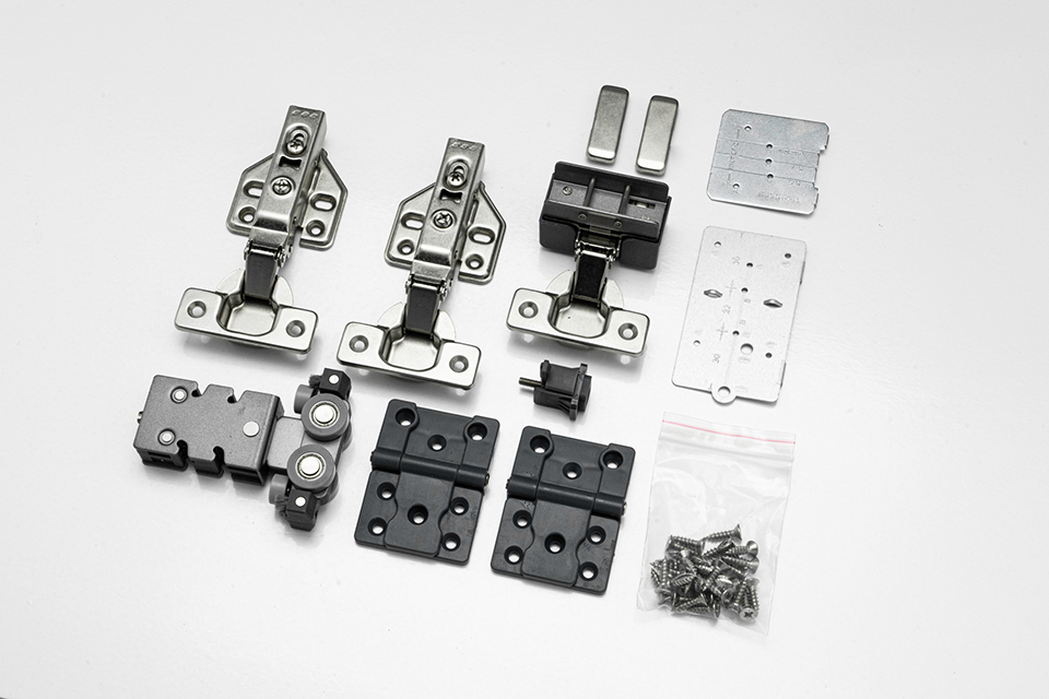 Sada kování pro dvoje skládací naložené dveře bez spodního vedení. Maximální rozměr jednoho křídla - 500 x 1200mm. Tloušťka materiálu - 18 - 25mm. Maximállní nosnost - 15kg/1 křídlo. Pravolevá verze. Včetně bočních závěsů, vrtací šablony a spojovacího materiálu.