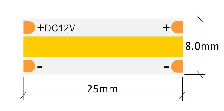 COB LED pásek s vysoce svítícími diodami v metráži, s hustě umístěnými čipy, zajišťujícími souvislou linii, barva světla studená bílá +-6500K, index podání barev Ra>90, tzn. že světlo je velmi podobné přirozenému dennímu světlu!.